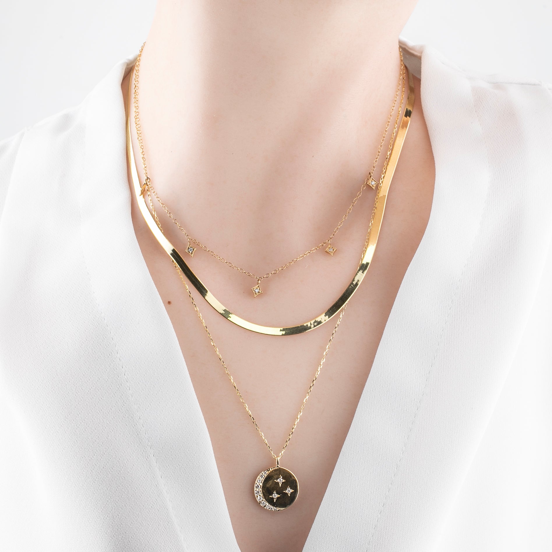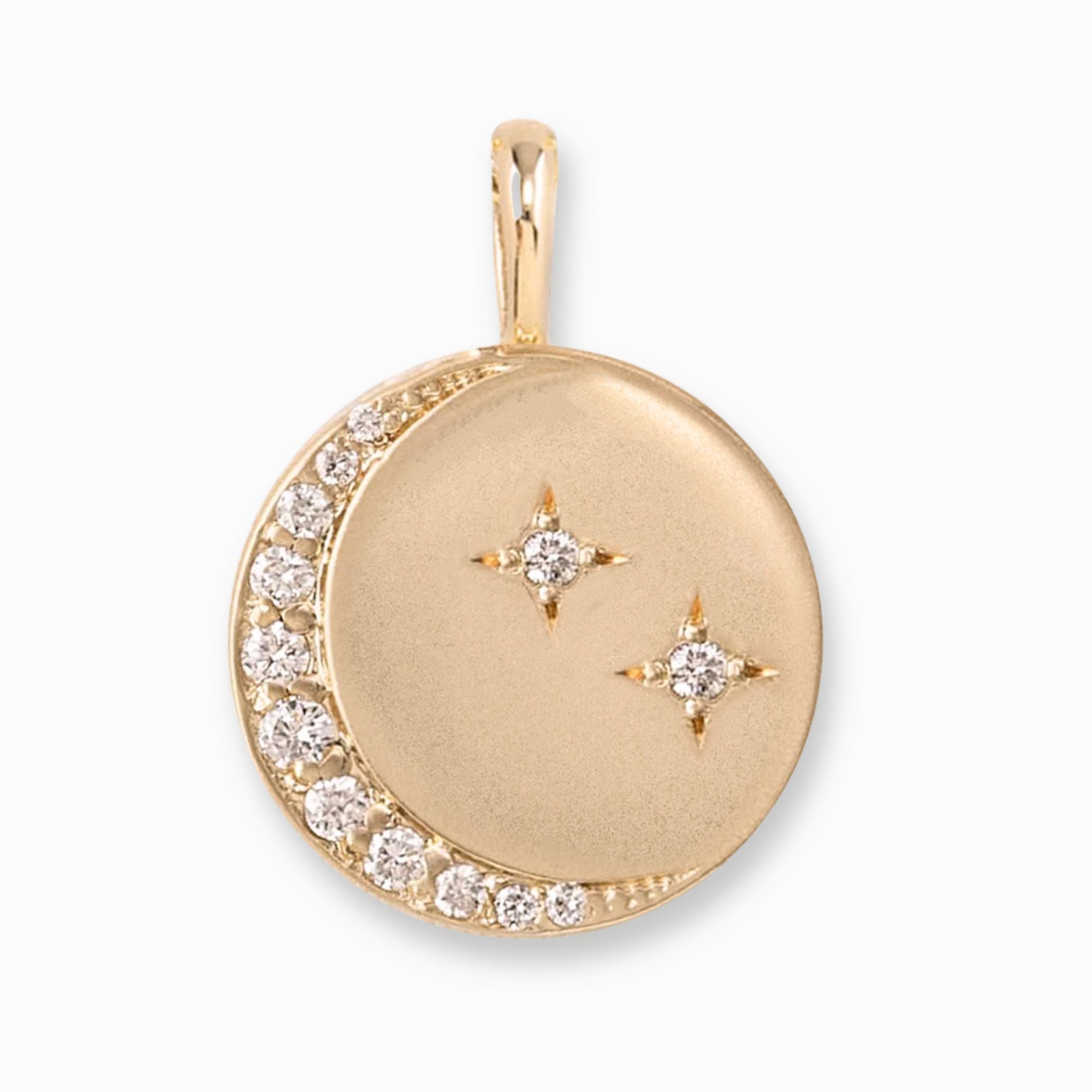 14k solid gold round disc measures 15mmx15mm with pave diamond set in the shape of a crescent moon. The surface has a soft brushed matte finish which is a great contrast with sparkly diamonds. This necklace can be personalized by adding a star with a diamond to symbolize someone special to you.